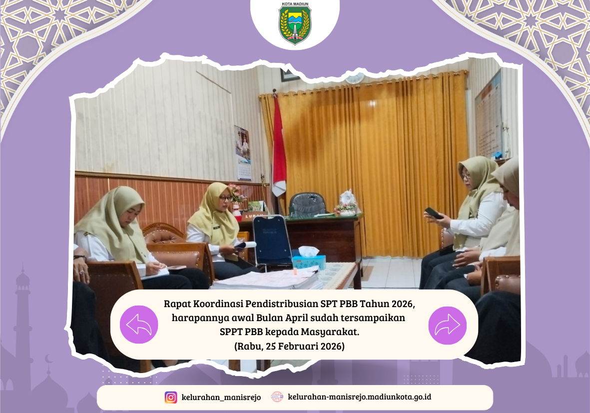 Pegawai Kelurahan Manisrejo melaksanakan rapat internal guna membahas strategi pendistribusian Surat Pemberitahuan Pajak Terhutang (SPPT) Pajak Bumi dan Bangunan (PBB) tahun 2026. Rapat yang dipimpin langsung oleh Lurah Manisrejo ini berlangsung di ruang kerja Lurah Manisrejo pada Rabu (25/02).